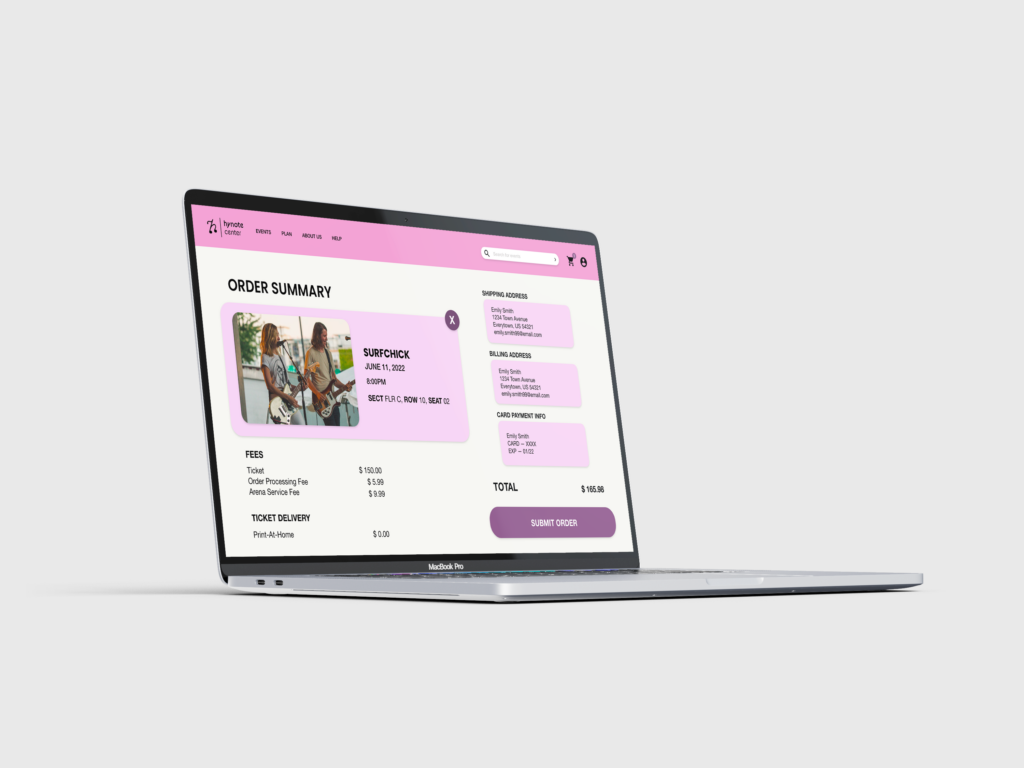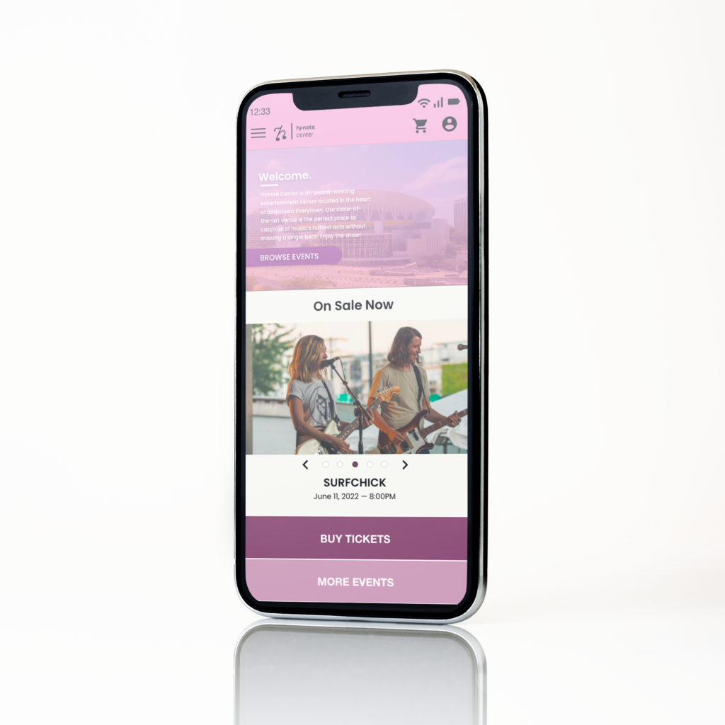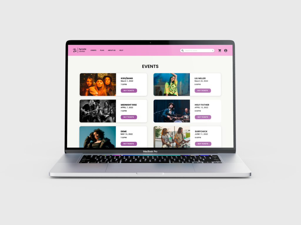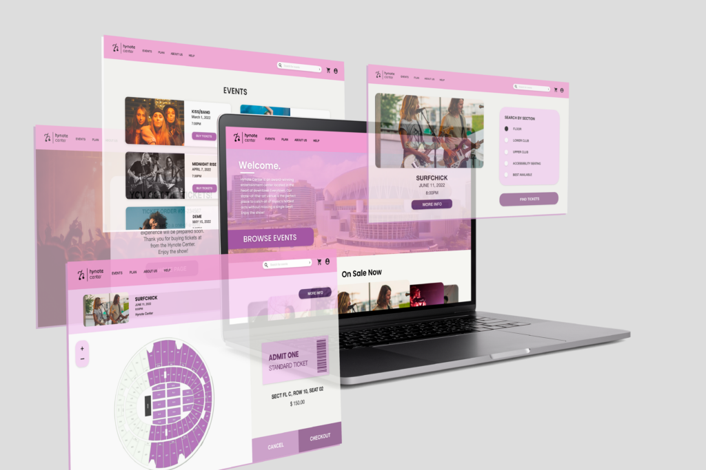 Website and app design based on a fictitious music venue, a multi-purpose arena called the Hynote Center (pronounced like “high note”). Depicts event listings and ticket buying process.