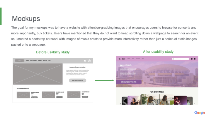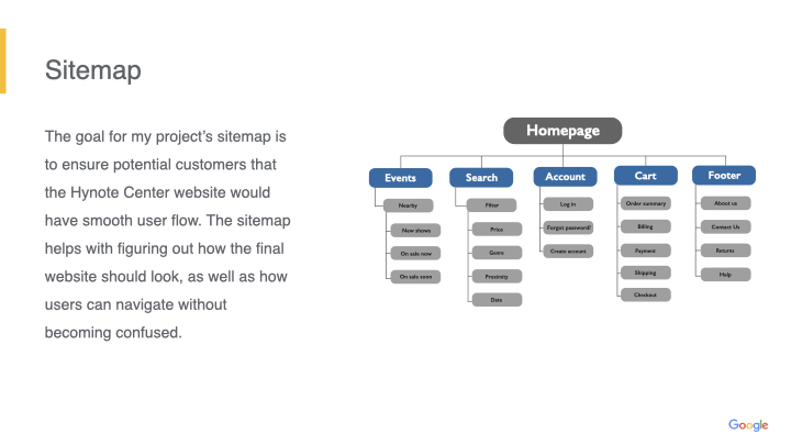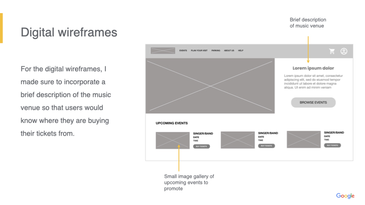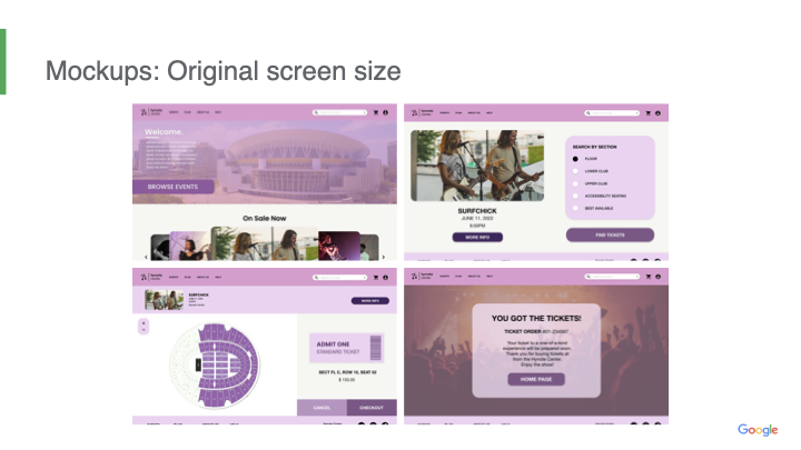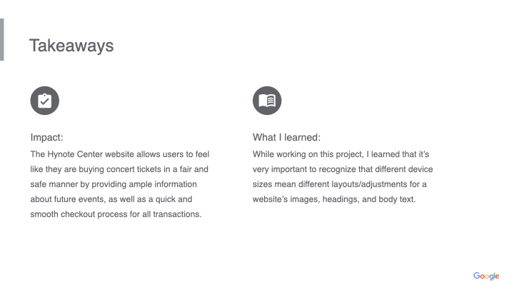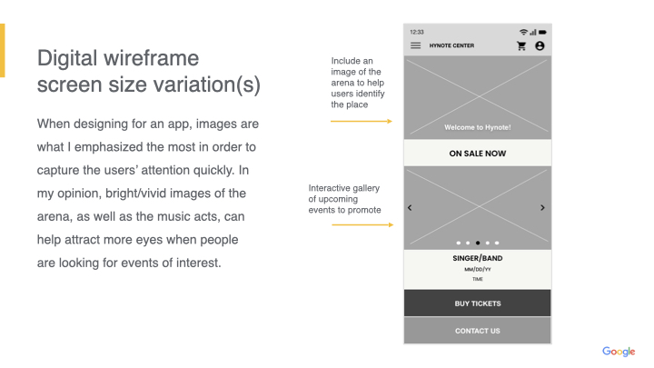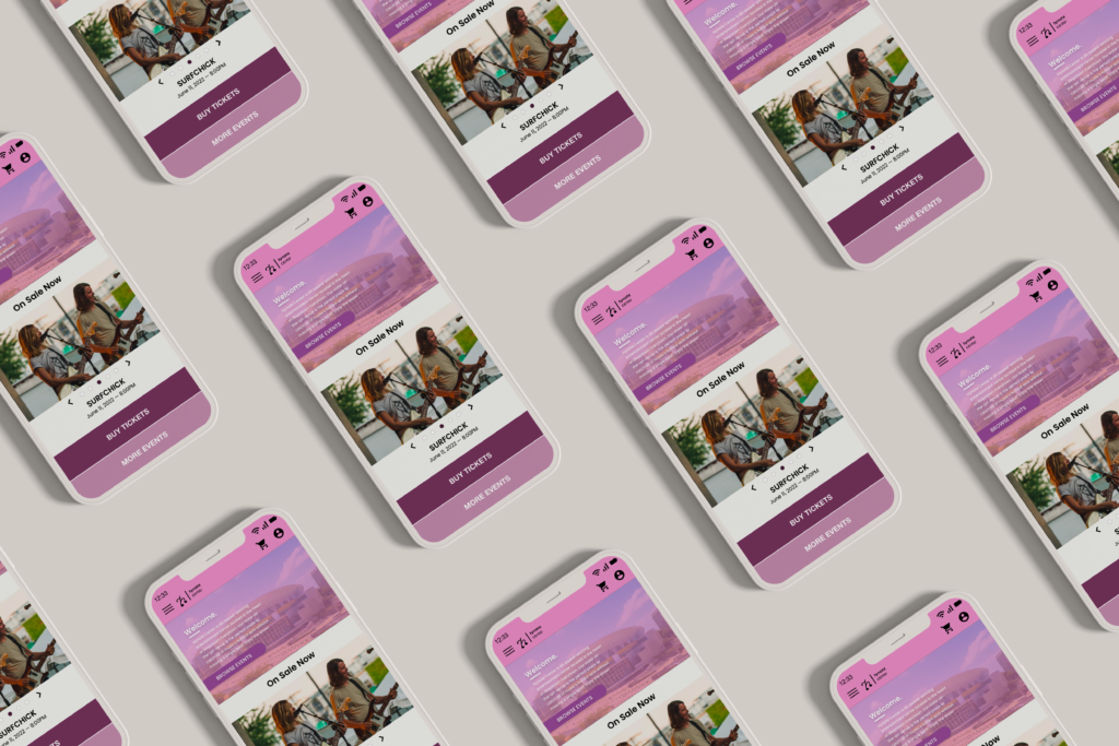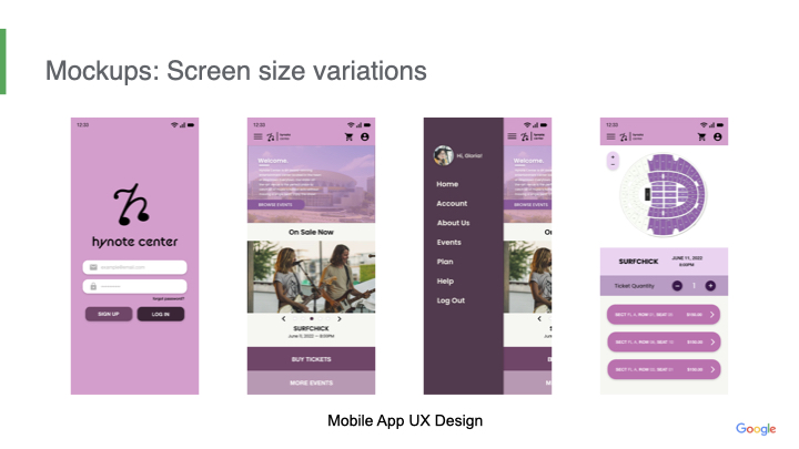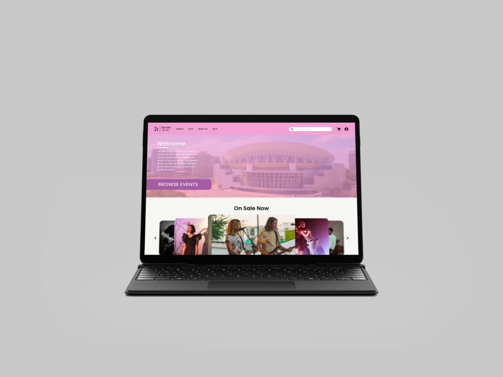 Website and app design based on a fictitious music venue, a multi-purpose arena called the Hynote Center (pronounced like “high note”). Depicts event listings and ticket buying process.